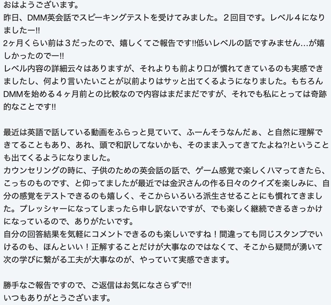 英語を話せることが学校教育の延長になく、環境や各家庭の努力でしか実らない現状には、教育改革を一番に望みますが、それに間に合わない子供たちも、この方法を自ら行うことができれば、救われるんだろうなと思いました。